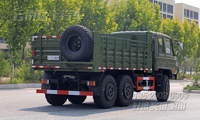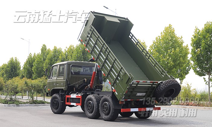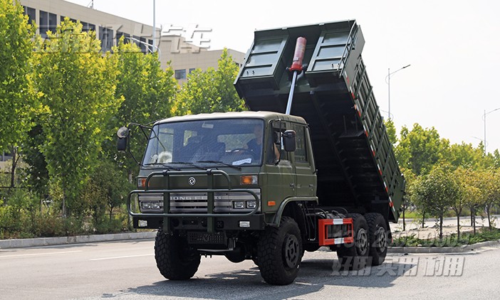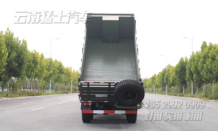EQ2102雙排越野自卸汽車采用東風經典車型EQ2102作為底盤,該底盤有著優秀的越野性能,在山路、森林、沼澤、沙漠、雪域中有著良好的通過性。改裝成自卸后,將備胎移動到貨箱后方,單獨設計備胎架,一方面可以增加貨箱容積,另一方面也方便前置舉升油缸的正常使用。